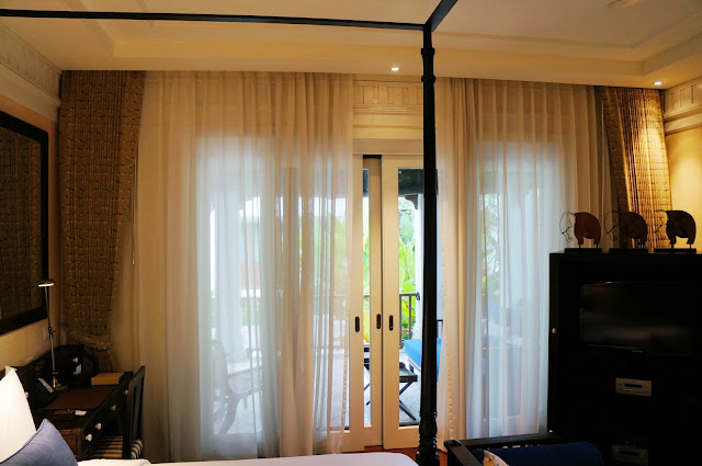房間的裝潢配置極佳,除了有個前陽台可供休憩,還有個小後花園,配置露天花灑(不過外頭沒熱水)。浴缸本身所在的空間美得宛如一幅畫。這回或許因為住房率很高,我沒能被升級到其他房型,但我愛極了這個基本房型沙發座椅的配色-深藍或土耳其藍,如同餐廳跟Lounge裡。較高級的房型都是紅白的搭配,或許更有豪華感,但我深愛這樣內斂雋永的藍色,所以反而有些慶幸沒被昇等。